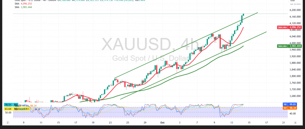 تشهد أسعار الذهب (XAU/USD) موجة ارتفاعات حادة متتالية ضمن مسار صاعد قوي، لتسجل مستوى قياسي جديد عند 4180 دولاراً للأونصة وقت إعداد التقرير، مدعومة بتزايد الطلب على الملاذات الآمنة