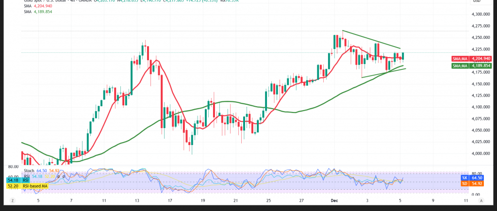 نور تريندز / التحليل الفني ودراسة حركة الاسعار / الذهب عند مفترق طرق! تراجع أم إختراق 5-12-2025