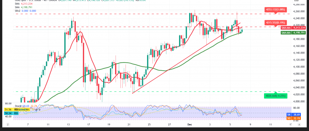 نور تريندز / التحليل الفني ودراسة حركة الاسعار / الذهب في حالة ترقّب… صراع بين الصعود والهبوط! 8-12-2025