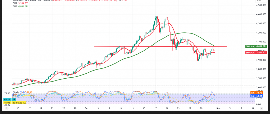 تداولات مختلطة دون إتجاة لحظي واضح لأسعار الذهب XAU-USD مسجلاً أعلى سعر له 4046 بعد تراجع لمستويات 3915 دولاراً للأونصة.