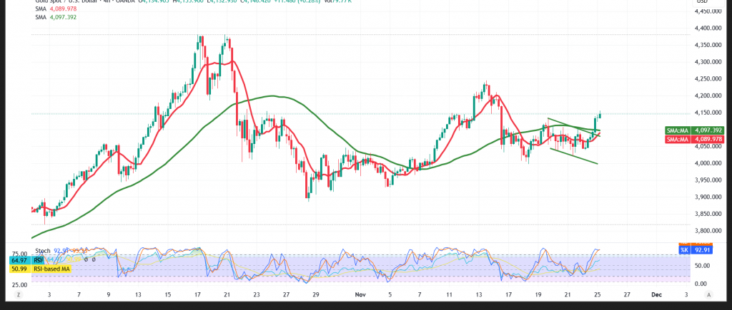 قفزت أسعار الذهب XAU-USD من جديد بعد الإرتكاز على أرصية الدعم الصلبة عند سعر 4040 لينجح في إختراق مستوى 4100 دولار.