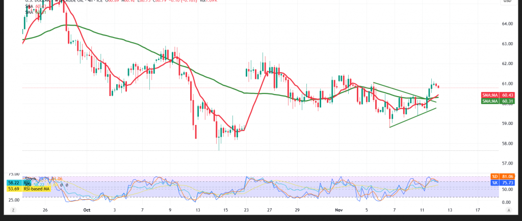 إتجاة مائل للصعود عاد للسيطرة على أسعار العقود الآجلة للنفط الخام الأمريكي WTI مسجلاً أعلى مستوى له 61.25 دولاراً.