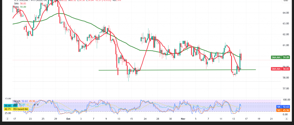 نور تريندز / التحليل الفني ودراسة حركة الاسعار / النفط يحقق إرتداد فني صاعد 14-11-2025