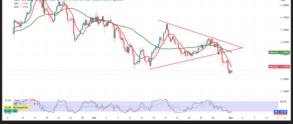 إتجاة هابط سيطر على تحركات زوج اليورو دولار EUR-USD بنهاية تعاملات الأسبوع الماضي ليتماشى مع توقعتنا السلبية ملامسة المستهدف الأول 1.1550 مسجلاً أدنى مستوى له 1.1532.