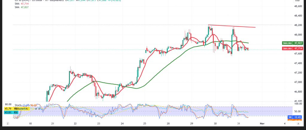 قد نشهد ميل هابط مؤقت نتيجة ثبات التداول دون مستوى مقاومة 47820 بهدف إعادة إختبار 47560 وقد يمتد سيناريو إعادة الإختبار 47425.