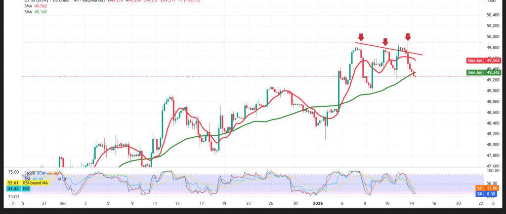عمليات جني أرباح بعد تسجيل مستوى 49900، عادت المتوسطات المتحركة البسيطة للضغط على السعر من الأعلى، يرافقها تراجع واضح في الزخم مع ظهور إشارات سلبية على مؤشرات القوة النسبية.