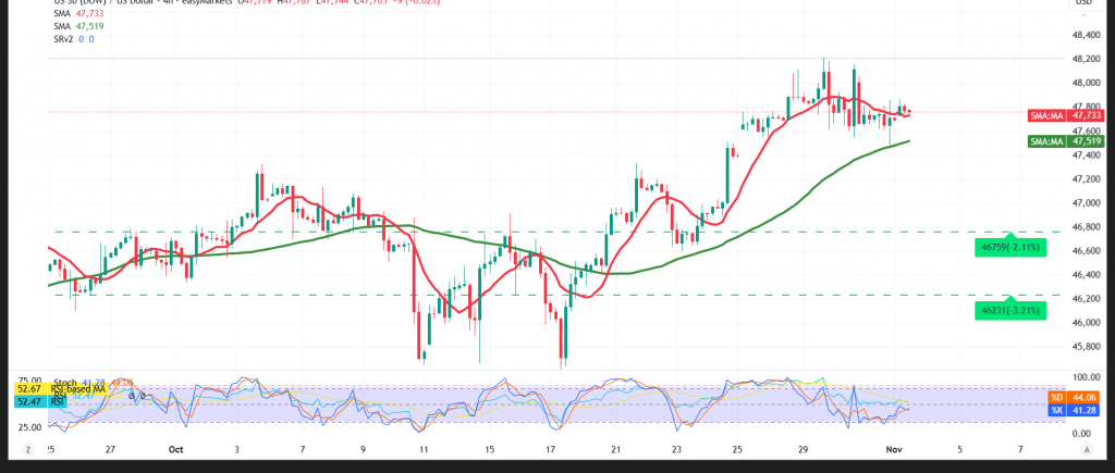 قد نشهد ميل صاعد خلال تعاملات جلسة التداول الحالية شرط أن نشهد إختراق واضح وصريح لمستوى مقاومة 47800 مستهدفين 47850 مقامة أولية ويليها 47920.