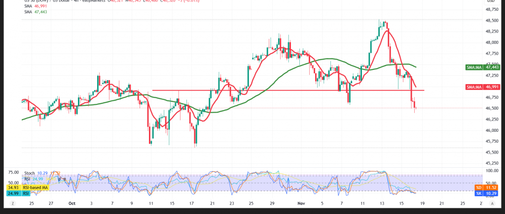تكبد مؤشر داوجونز الصناعي DJI30 خسائر حادة في بورصة وول ستريت خلال أولى تعاملات الأسبوع الجاري مسجلاً أدنى مستوى له 46397.