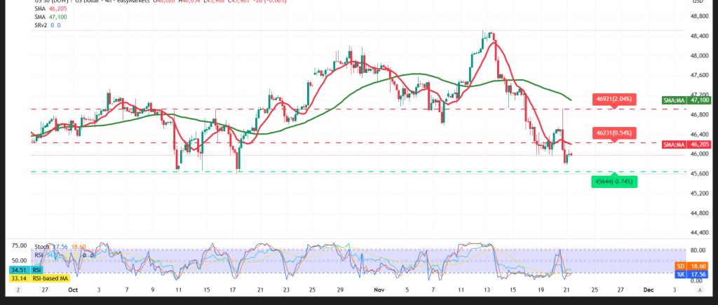 خسائر ملحوظة سجلها مؤشر داوجونز الصناعي في بورصة وول ستريت موضحين خلال التقرير الفني السابق بأن التسلل دون 46260 لإستهداف 46140 وكسر الدعم المذكور يُمدد من الخسائرة لزيارة 45785 مسجلاً 45780.