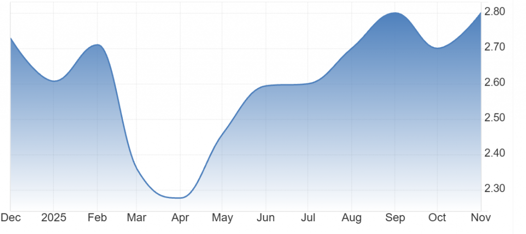 وارتفعت القراءة السنوية للمؤشر بواقع 2.7% في أكتوبر الماضي، مما يشير إلى ارتفاع أقل من القراءة السابقة المسجلة في نفس الشهر من العام السابق التي سجلت 2.8%.