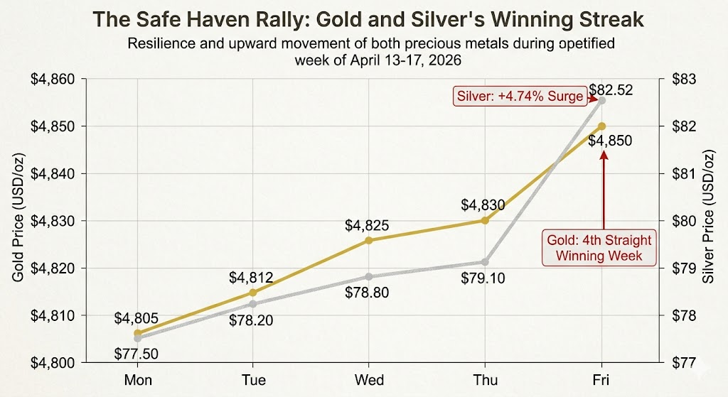 أنهى الذهب الأسبوع على ارتفاع بلغ ٠.٨٪ ليكمل سلسلة رابحة رابعة متتالية. ارتفع سعر الذهب قرابة ١٪ فوق ٤٨٥٠ دولارا للأونصة في ختام يوم الجمعة، مع تفاؤل المستثمرين بأن اتفاقا دائما بين واشنطن وطهران قد يخفض مخاطر التضخم ويقلص الحاجة إلى تشديد السياسة النقدية من قبل البنوك المركزية. كان سعر الذهب قد تجاوز ٤٨٠٠ دولار للأونصة في ١٤ أبريل، بما يمثل ارتفاعا يزيد على ٥٠٪ على أساس سنوي.