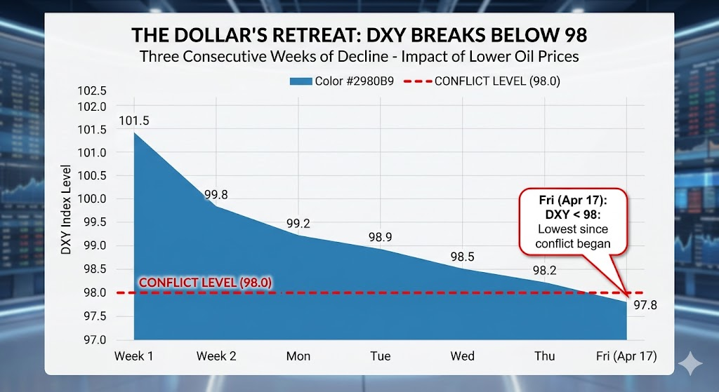 تراجع مؤشر الدولار DXY إلى ما دون ٩٨ نقطة يوم الجمعة، مسجلا أدنى مستوياته منذ اندلاع النزاع مع إيران، إذ أسهم انخفاض أسعار النفط في تخفيف توقعات التضخم وتقليص الرهانات على تشديد الفيدرالي الأمريكي. وفي مجمل الأسبوع، تراجع مؤشر الدولار نحو ٠.٥٪ لأسبوعه الهابط الثالث على التوالي.