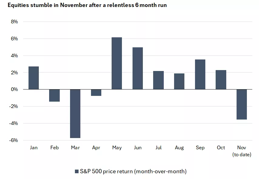 تبدي الأسهم المدفوعة بالذكاء الاصطناعي، التي كانت المحرك الرئيسي وراء تقدم السوق لهذا العام، الآن، علامات على التراجع. وشهدت مجموعة السبعة الرائعين—آبل، أمازون، ألفابت، ميتا، مايكروسوفت، إنفيديا، وتسلا— انخفاضاً بحسب القيمة السوقية بنسبة 5.8% في نوفمبر، مما يؤدي إلى تراجع موازٍ للمؤشرات الأوسع. وأثرت هذه الضغوط بشكل ملحوظ على ناسداك المركب، الذي انخفض 6.65% منذ بداية الشهر، مما يعكس تراجعاً أوسع في المعايير الثقيلة بالتكنولوجيا.