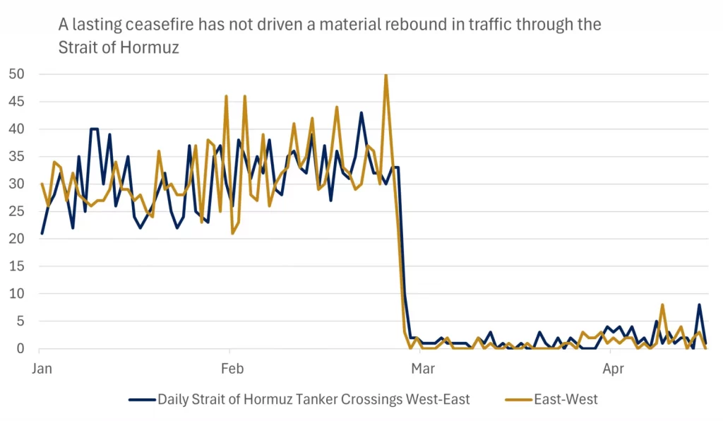 وحافظ وقف إطلاق النار بين الولايات المتحدة وإيران على تماسكه، إلا أن استمرار إغلاق مضيق هرمز أبقى الضغوط مرتفعة على أسواق الطاقة العالمية، في ظل غياب تقدم ملموس نحو اتفاق سلام دائم.