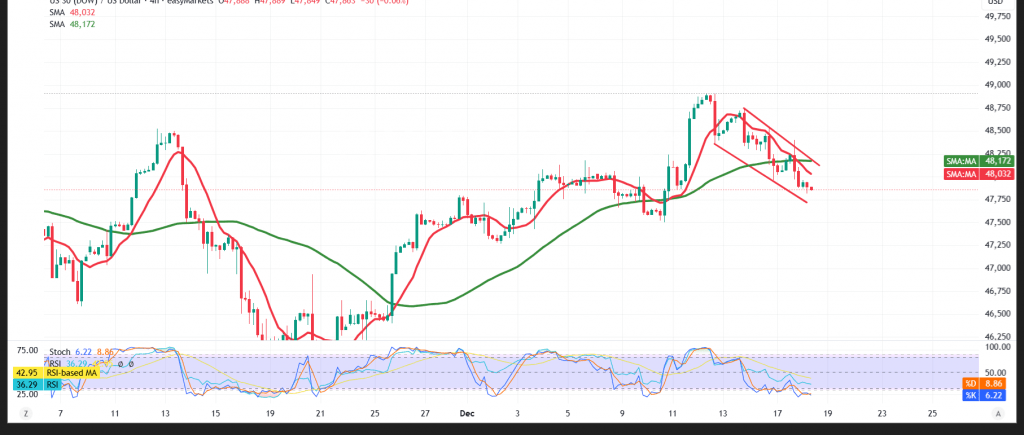 The Dow Jones Industrial Average extended its downward trend in line with our negative outlook, reaching the targeted level of 48,145 and recording a low of 47,818.