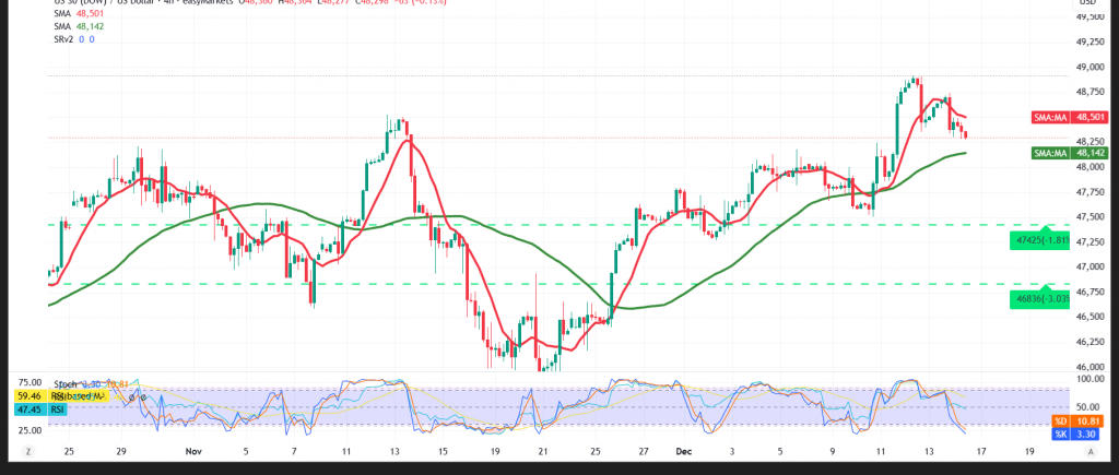 As long as daily trading remains below the 48,540 resistance level, the index may be exposed to further downside, with a potential retest of 48,145. Conversely, a return to trading above 48,540 could support a recovery move toward 48,610, followed by 48,680.