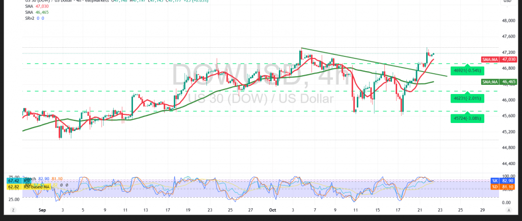 The Dow Jones Industrial Average extended its advance, exceeding the prior target at 47,160 and printing a high at 47,355, keeping the near-term tone constructive.