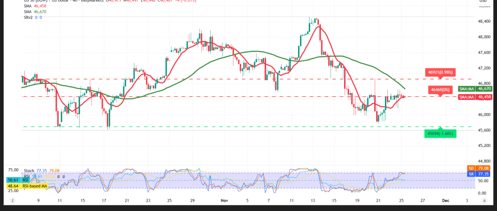 On the other hand, a clear and sustained break below the 46,200 support zone would expose the index to additional downside pressure, potentially triggering a move toward 45,930.