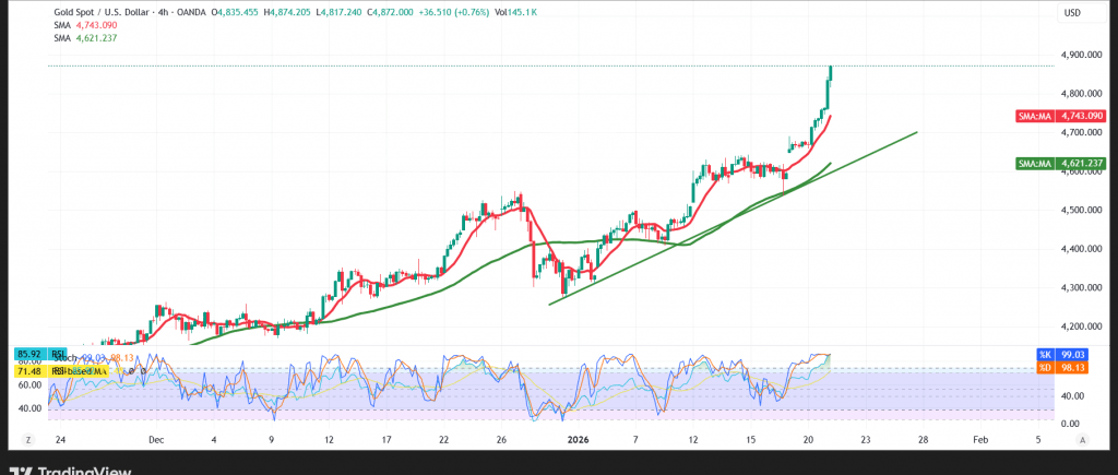 Gold prices (XAU/USD) staged an exceptional rally, surpassing all technical targets outlined in the previous report at $4,750. During early trading, the metal surged to a new all-time high near $4,877 per ounce, reflecting overwhelming buying pressure and strong bullish conviction.