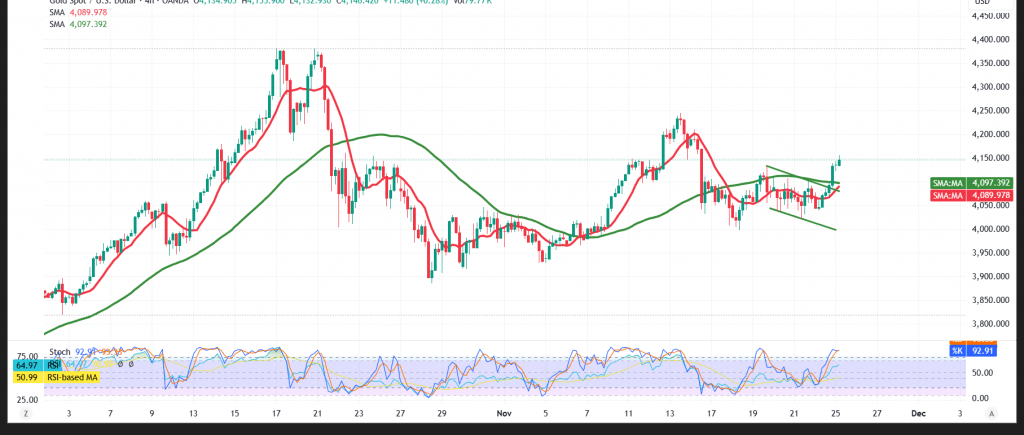 Gold prices (XAU/USD) rebounded after stabilizing above the $4040 support level, moving decisively through the $4100 barrier.