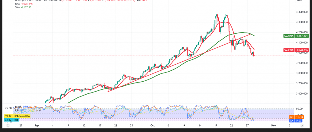 Gold extended its decline in the prior session, in line with the bearish view, approaching the projected $3,985 target and printing a low at $3,963.