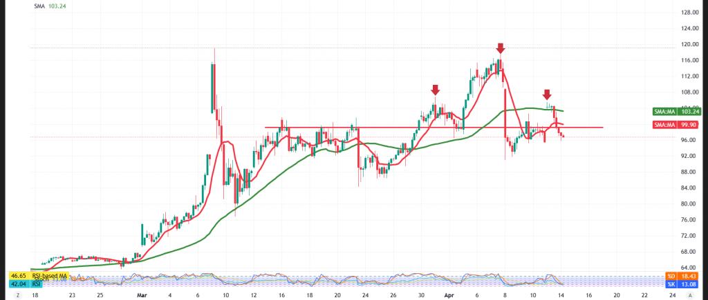 Prices have experienced a significant decline, falling below the $100 per barrel level. The failure to breach the simple moving averages has resulted in a bearish crossover, with these key moving averages now exerting downward pressure on price action.