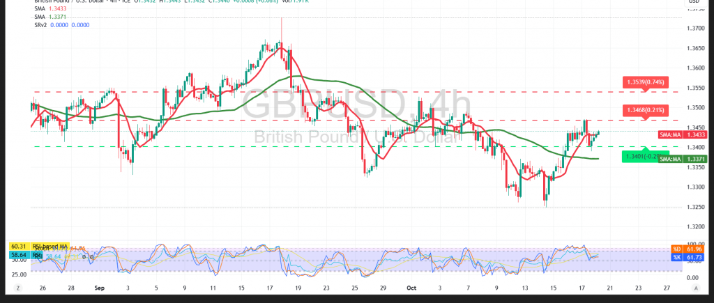 RSI is hovering near overbought, hinting at fading momentum. The 50-period SMA sits near 1.3450, acting as overhead resistance and reinforcing a cautious tone on the 4-hour chart.