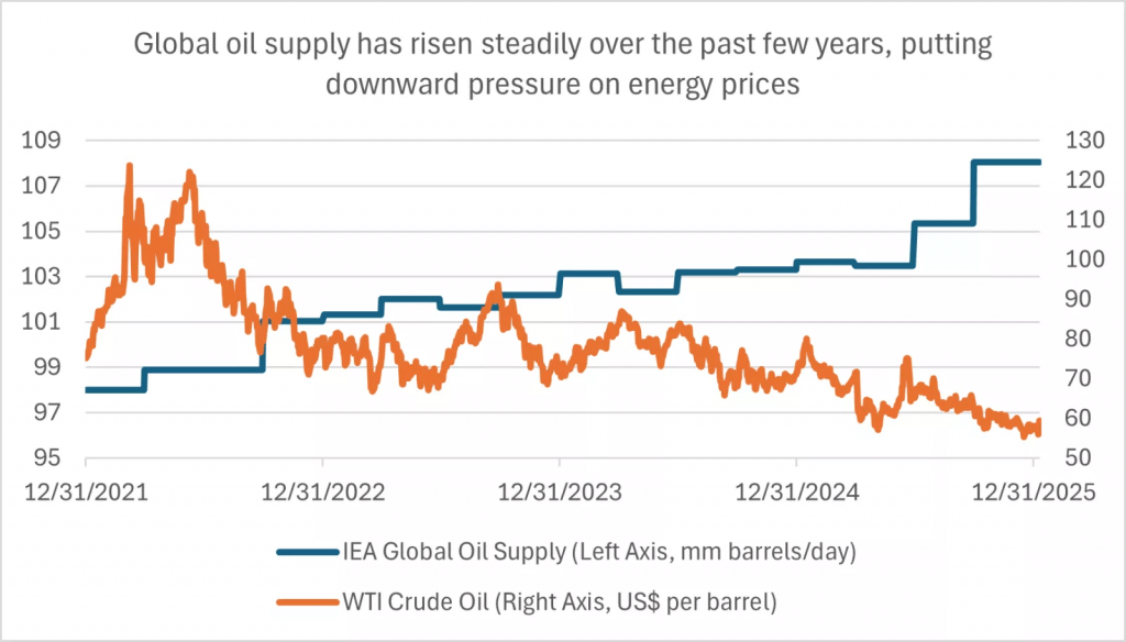 Meanwhile, tensions in Iran and Russia raised additional supply disruption concerns, supporting energy prices despite the difficult context of 2025, which saw the worst annual oil price decline in five years.