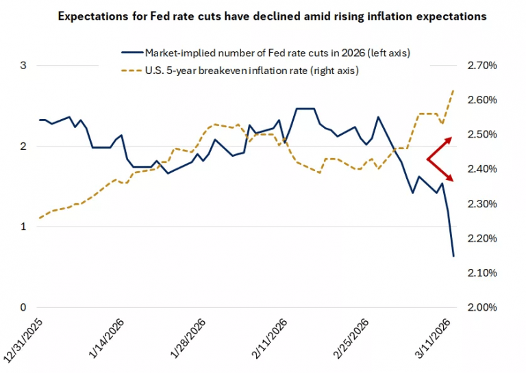 Recent disruptions in global oil supplies, stemming from the conflict in the Middle East, drove prices to elevated levels last week, sparking a wave of volatility in financial markets across key asset classes. While global equity markets ended the past week lower, Treasury yields saw a significant rise. Despite recent inflation data suggesting a gradual easing of price pressures, the latest spike in energy prices warns of renewed upward pressures on the horizon. This presents monetary policymakers with a complex landscape ahead of the highly anticipated Federal Reserve meeting this week.